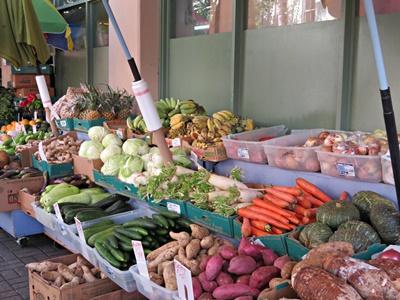 Less hungry, we headed to the far end of the shopping center to the Foodland Farms to hunt and gather groceries. Happily, the store exceeded our expectations. It was packed with shoppers, a group of people perched on barstools doing a wine tasting, another group participating in a cooking class, and tired office workers choosing from dozens (and dozens) of prepared foods in rows of heated and cooled food bars, featuring poke and seafood, meats, traditional and Asian foods, olives and other pickled yummies, and mochi, along with cases of ready-to-eat produce. Complementing their meat, fish, bakery, and deli counters, they have stations where you could order pizza, bubble tea, coffee drinks, ice cream treats, and other freshly prepared foods.