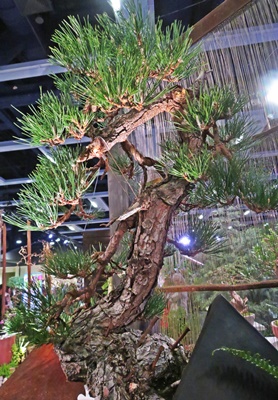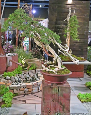 Steps away from the Fleurs de Villes were large display gardens, some of which were breathtaking with giant boulders, dramatic stone sculptures, full-sized trees and hundred-year old bonsais, stone pathways, flowing water features, greenhouses, light-festooned gazebo and pergola, playhouse, vintage teardrop trailer, and creative seating areas.