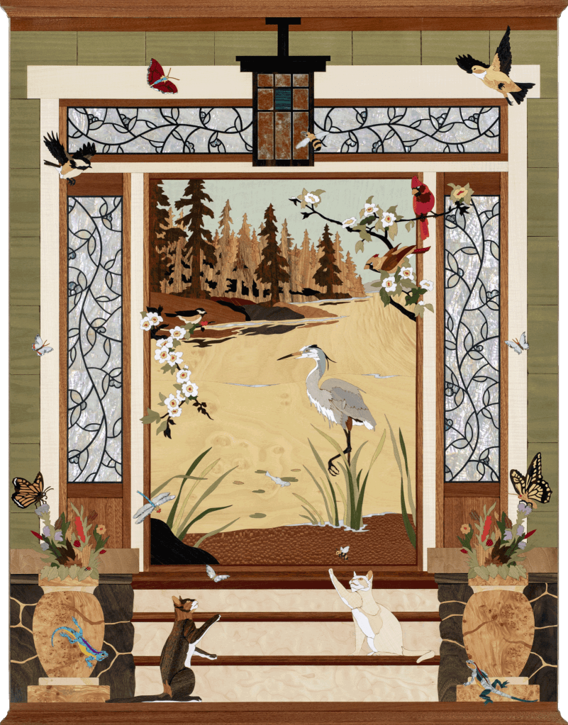 Hands down, the most impressive art was from Hudson River Inlay, which makes framed mirrors, panels and furniture with inlaid wood, shell, and stone. My favorite piece was called Lake Serenity Bungalow, which showed the front steps of a bungalow-style house with ornate glass on either side of the door, and two cats batting at two butterflies. On either side of the door are urns with pretty flowers and more butterflies. Through the door is a wooded area with a pond in front, home to a dragonfly, blue heron, and numerous birds perched on dogwood branches.
