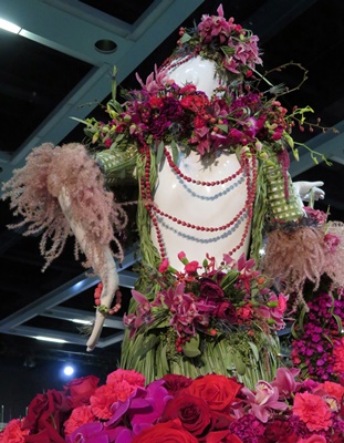 At the entrance to the Northwest Flower and Garden Festival was Fleurs de Villes, a series of life-size mannequins adorned with flowers from elaborate hats to sweeping trains, and whimsical floral purses and shoes. They were like mini Pasadena Rose Festival floats with thousands of fresh and dried flowers, grasses, mosses, and leaves.
