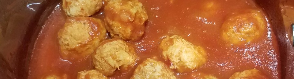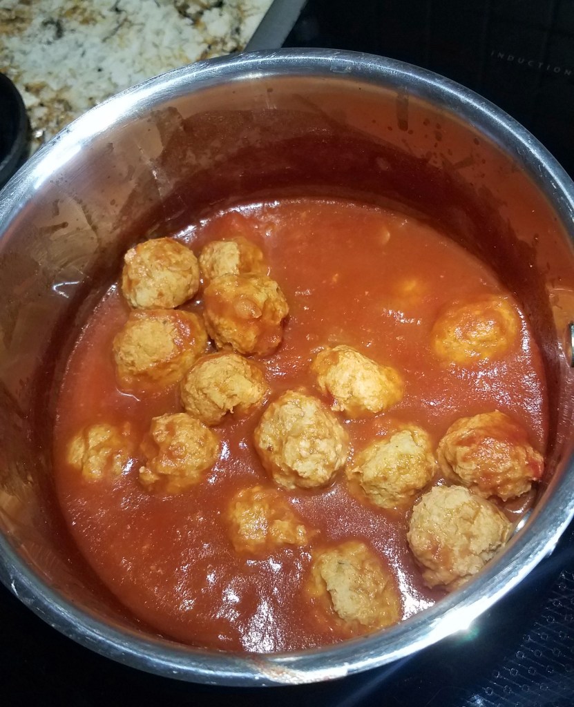Shape the meatballs. I made them the size of large cherry tomatoes. Carefully drop some of the meatballs into the sauce so they don’t touch. Let them cook for a couple of minutes until they firm up, then carefully push them off to the side and add a few more meatballs. Repeat by pushing the cooked meatballs off to the size and add more meatballs until all the meatballs are in the pot.